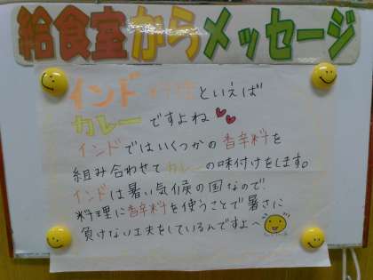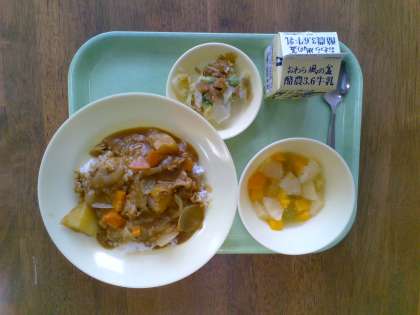 カレーのお供と言えば「福神漬け」ですが、本日登場したのは「福神和え」でした。多様な野菜(7種類?)が使われることから「七福神」に因んで名付けられたとか。本日和えられているのは白菜。白菜には、赤血球の生成を助ける葉酸というビタミンも含まれているそうです。