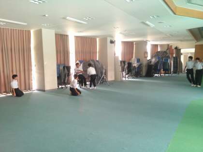 多目的ホールで「だるまさん転んだ」を楽しむ人たち