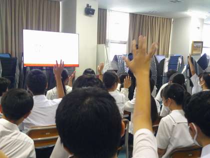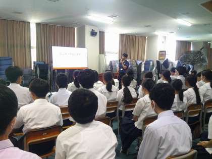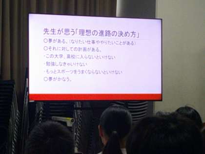 教育実習生から、進路選択についての話を聞きました。生徒たちは「選択肢を増やす」という言葉に共感しているようでした。