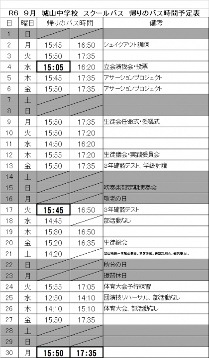 9月スクールバス運行予定表に変更があります。