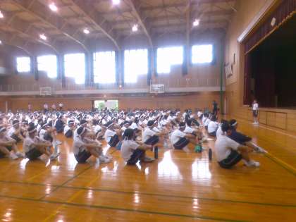 いよいよ体育大会に向けての練習が始まりました。全校生徒が体育館に集まって、全体会をしています。