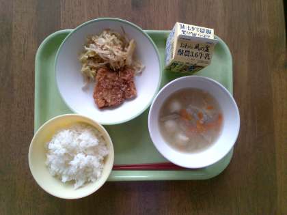 豚肉の香り揚げ いり大豆和え つみれ汁 ごはん 牛乳