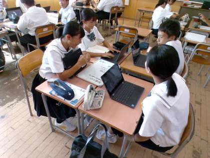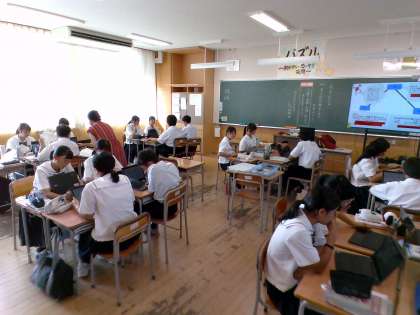 2組の様子です。一人一台端末とホワイトボートのハイブリッドで授業が行われていました。
