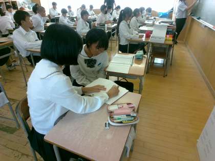 2年3組は数学(写真左)の授業中。自ずと、話合いが成立している。自分の考えを伝え、それについてのコメントを返す。会話ではなく、対話が学び合いの根本。とてもよい光景。