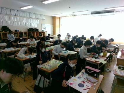 3年1組の美術(写真右)では、各自が作業中。配色を考えて、丁寧に塗ることが課題。配色を考えるのは、もちろん自分。他の誰かに考えてもらうのではない。