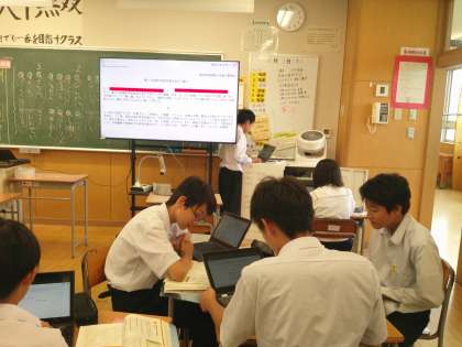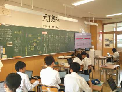 国語の時間です。端末機器を使って 案内文を作成する学習をしています。コツをつかんだ後は、学習形態を選んで、作成を進めています。