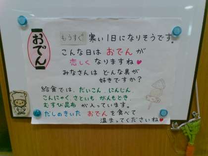 今は昔、知己のALTに「おでんはね、den(英語。巣、小部屋、隠れ家等の意)に、美味しい種がたくさん集まってきました。だから、Oh,den!って覚えればいいよ」と伝えたら「なるほど。これで一生忘れない」と言っていました。しかし・・・実際、おでんは何故おでんと言う名前?後で、由来を調べてみます。あ、私の好きなおでん種は銀杏の入った巾着です。How about you?