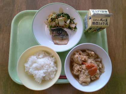 さばのみそ煮 いり大豆和え 卵とじ ごはん 牛乳