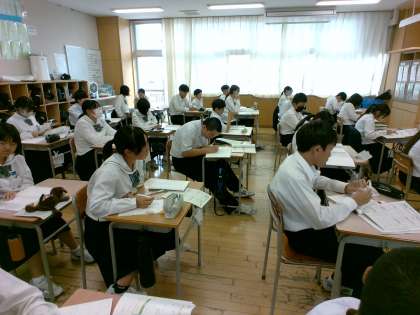 3組の様子です。今日は、証明のために必要な用語を頭にインプット(入力)する授業。生徒から「アウトプットは?」という声が飛ぶ。素晴らしい。手に入れた知識をもとに、証明にトライするのは来週のお楽しみ。