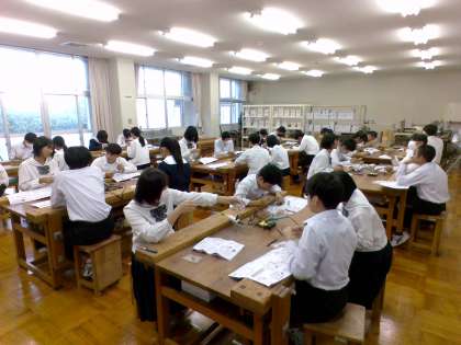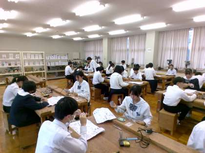 3組技術の様子です。様々な電子部品の取り付けを行っています。お互いに確認し合いながら実習を進めています。