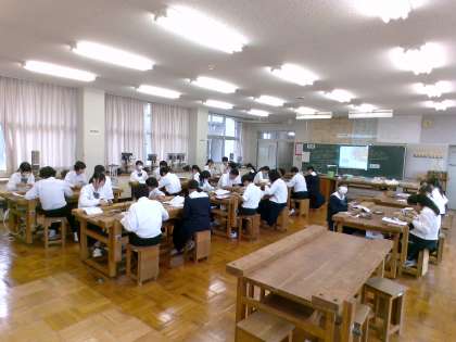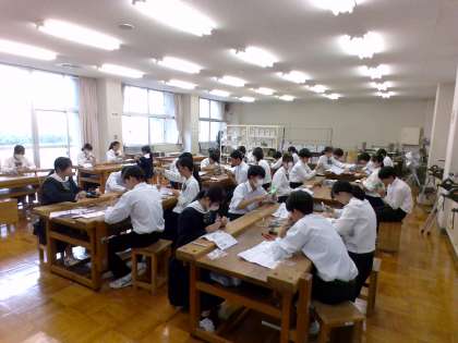1組技術です。ダイナモラジオの製作中です。火傷に十分注意して、正確に電子部品を取り付けないといけません。
