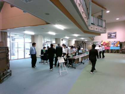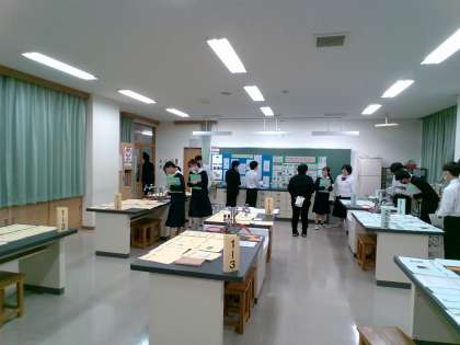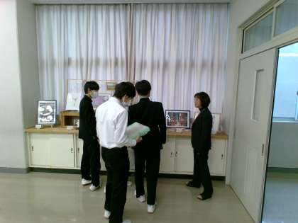 学年ごとに展示品を鑑賞する時間が設けられています。多目的ホールや視聴覚室、理科室、美術室、被服室や廊下に作品が飾られています。