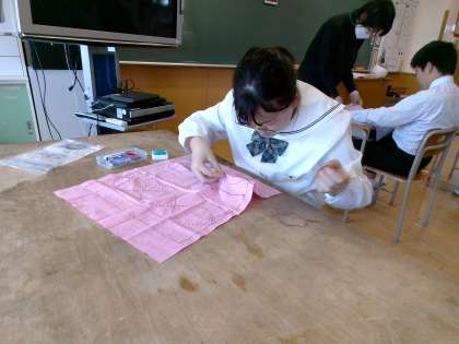 伝統柄を刺し子してお弁当包みを制作しています。ひと針ひと針丁寧に進めていますよ。完成が楽しみですね。