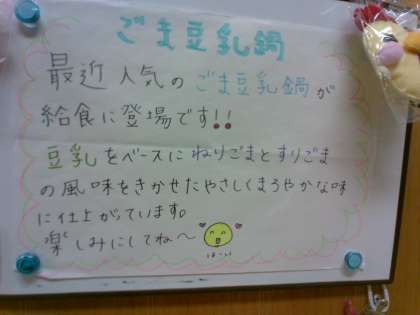 今日は、豆乳に金時豆と畑のタンパク質を味わえる献立でした。豆乳鍋はごま味が効いて美味しいですね。味わって食べましょう。