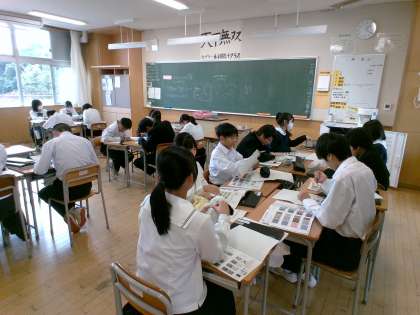 3組では、生活の中に生かされている文様についての学習が始まりました。