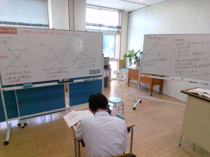 2組数学の様子です。2年生は、三角形の合同条件を使った証明について考えました。1年生の時に習った角の二等分線の証明を行いました。
