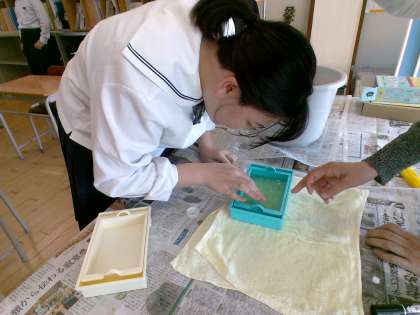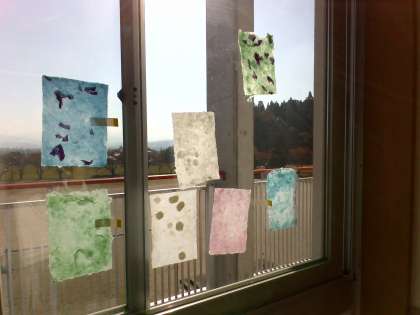 紙すきをして、手作りのはがきを作成しました。次回の国語の授業で「きせつの挨拶」の学習をしたあとに、このはがきを使って年賀状を作ることを計画しています。