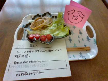 家庭科室で調理実習をしていた1年1組。なんと、豚のしょうが焼きを持ってきてくれました。火加減の調節が工夫点とのこと。調理の過程においても「工夫する」「考える」等のフェーズは必ずありますね。とても美味しかったです。
