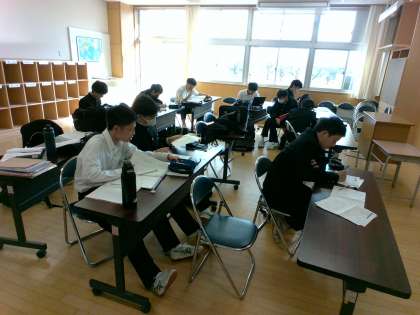 懇談会を待つ生徒の控室では、寸暇を惜しんで勉強に励む姿が見られました。
