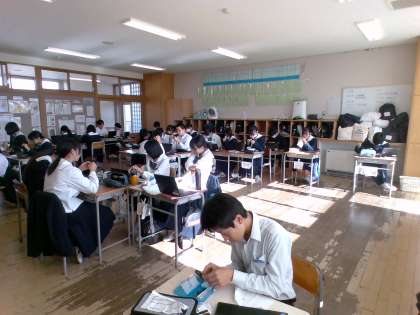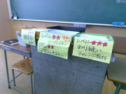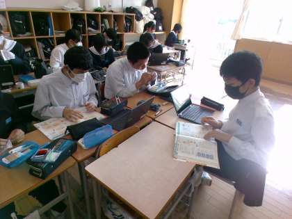 3組の被服実習の様子です。「なみ縫い」「ボタン付け」「まつり縫い」等、いくつかの課題の中から、今日取り組むものを自分で決めています。