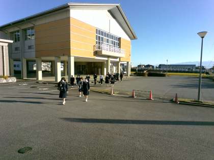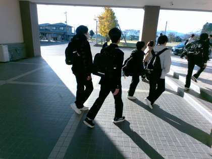 「立冬」の末候、金盞香(きんせんか さく)の末日となりました。穏やかな青空の下、影を長くしながら登校する生徒たちです。