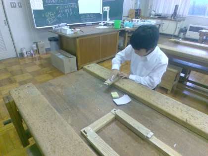 木の材料を木目に沿ってていねいに磨いています。