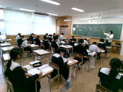 1年生(写真上)は基本的な作図の学習において「弦」と「弧」の説明を受けています。数学とは言え、その学びのプロセスにおいては、数字や記号より文字を目にすることの方が多い。言語はすべての学習の基本。