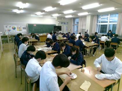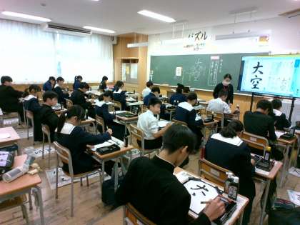 1年生(写真上)は書道の授業。この時節になると、どの学校でも見られる光景。一言もしゃべらず、ものすごい集中力で行書(「大空」)に取り組んでいます。