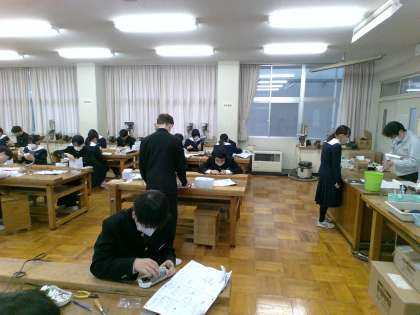 2年生(写真中)は、先の記事でも紹介のあったダイナモラジオの製作中。組立て説明書とにらめっこしたり、先生に見てもらったりしながら、作業に取り組んでいます。