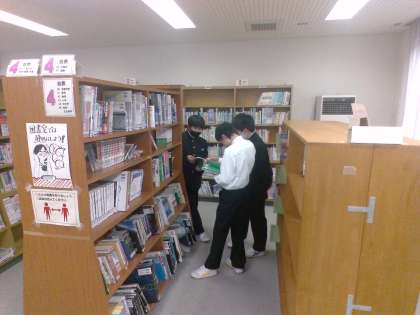 1組の様子です。学級活動の時間に図書室に行きました。最近はデジタル書籍が増えてきていますが、やはり実際に本を手に取り、読書することも大切ですね。