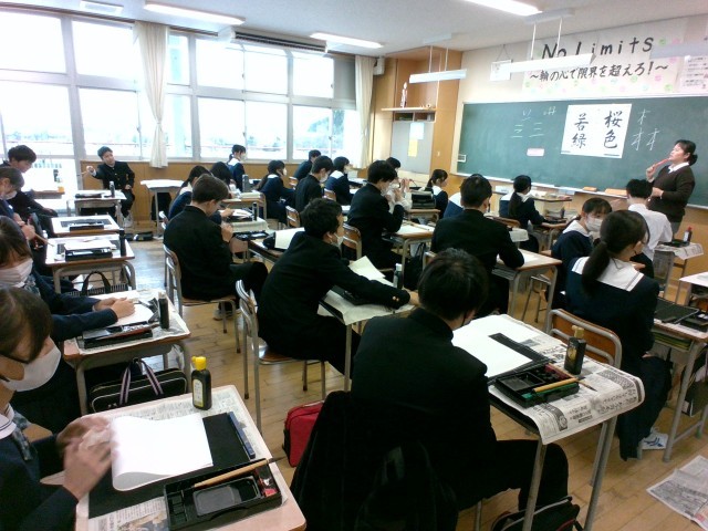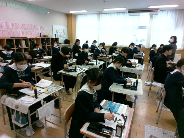 昨日の校内書初大会に引き続き、本日も墨の香り漂う授業中におじゃましました。