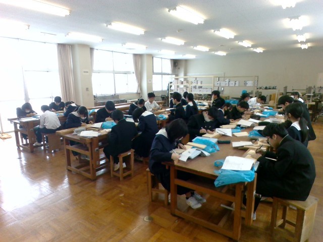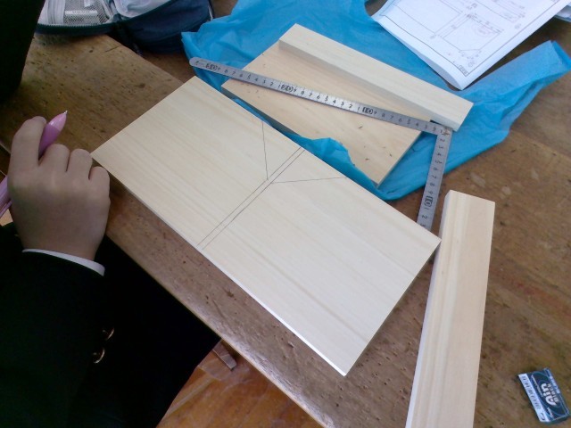 1組技術、ブックケースの製作の様子です。今日は「けがき」の作業をしました。1ミリもズレがないように、という強い気持ちが大切です。