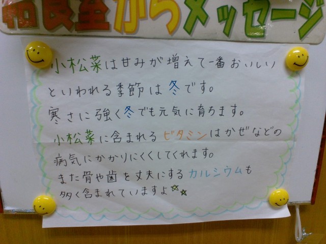 長い間、学校で勤務していますが「鉄たっぷり」と名の付く献立はおそらく初めてです。小松菜にも鉄分は含まれています。