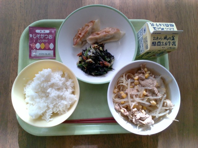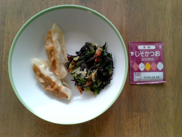 焼き餃子 鉄たっぷりサラダ サッポロラーメン しそかつおふりかけ(袋に「高鉄」と) ごはん 牛乳