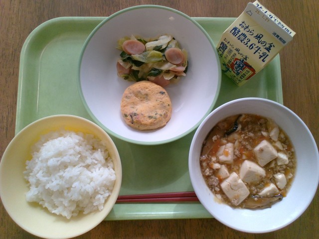 【本日の献立】 かにたま チンゲンサイソテー マーボー豆腐 ごはん 牛乳