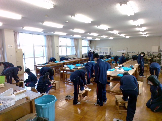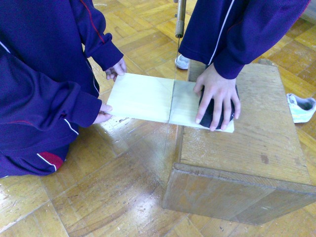1組技術、ブックケース製作の様子です。のこぎり挽きに挑戦しています。