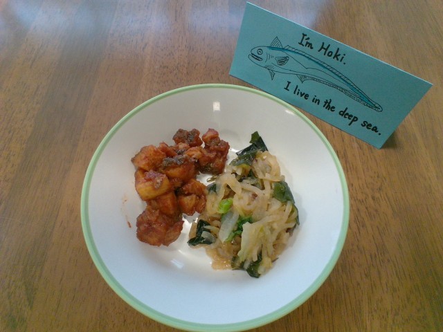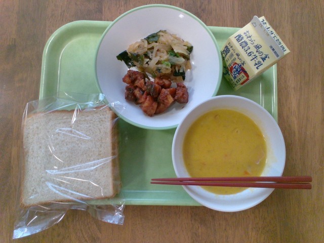 【本日の献立】 ホキのアングレス 海藻サラダ 野菜ポタージュ 食パン 牛乳