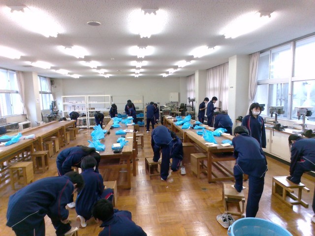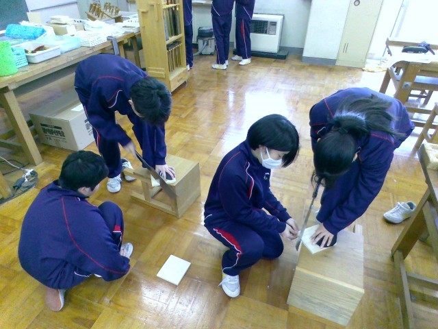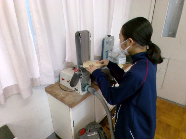 1組技術、ブックケース製作の様子です。ベルトサンダーでの削り、のこぎり挽き、ボール盤での穴あけの作業に取り組んでいます。作業では、「焦らない」ことが大切ですね。