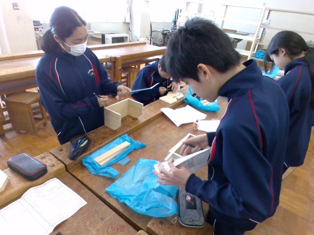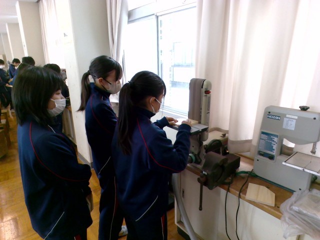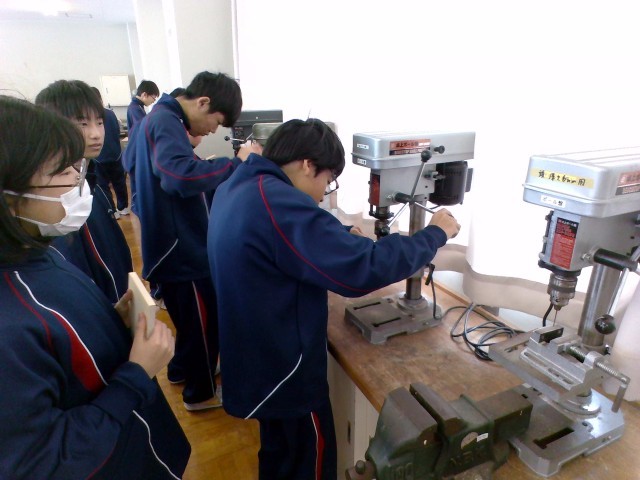 1組技術、ブックケース製作の様子です。組み立て、ボール盤による穴あけ、ベルトサンダーでの削りの様子です。