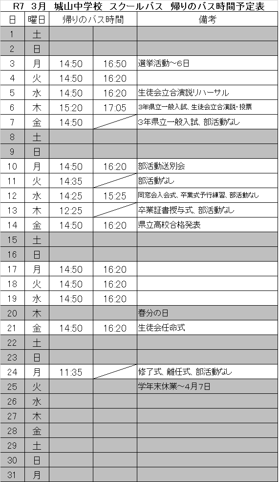 いよいよ年度末を迎えます。3月のスクールバス予定表です。
