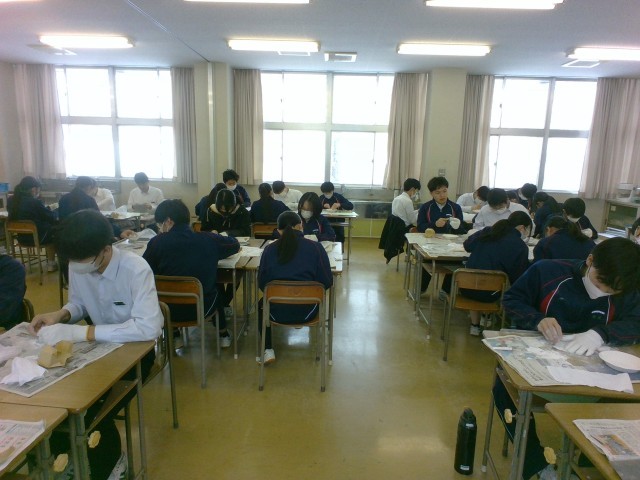 2組(写真左)は、curving a stone in the art room です。板書には「今日で仕上げです」と。3年生、いろいろなことに「中学校生活最後の・・・」が付く時期になりましたね。