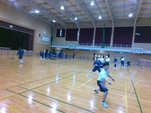 1組(写真右)は、playing badminton or table tennis in the gym です。みんなすごく楽しそうにプレーしています。たまには、思いっ切り体を動かさないと。
