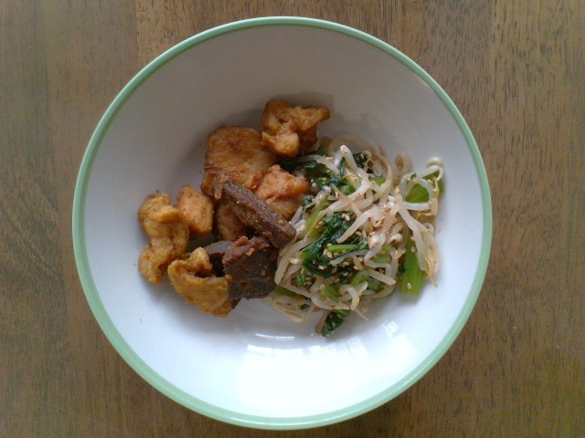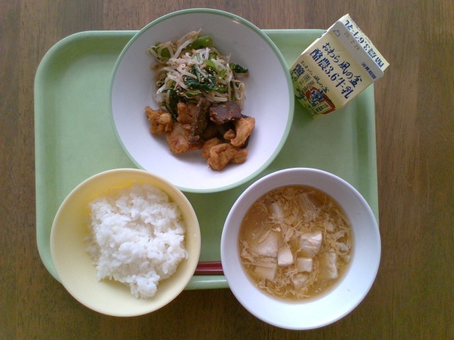 【本日の献立】 鶏肉とレバーのカレー風味 ナムル かきたま汁 ごはん 牛乳