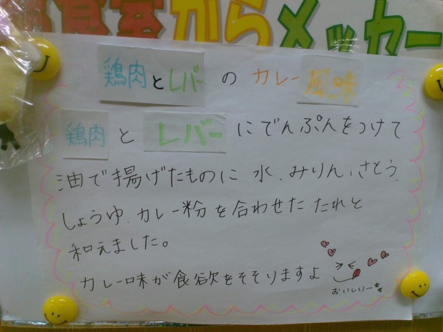 鶏肉とレバーのカレー風味は、大変食べやすく、おいしかったです。給食室の掲示を見ますと、随分と手間ひまをかけてつくられているのですね。ありがとうございます。