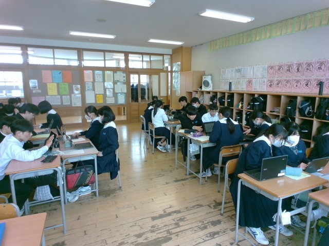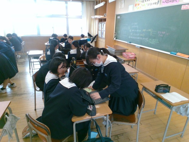 給食後。2年生は、修学旅行における班別学習のコースを考案中です。