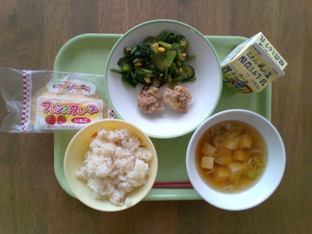 【本日は入学お祝い献立と銘打ってます】 鶏肉のから揚げ コーン和え すまし汁 お祝いデザート ちらし寿司 milk