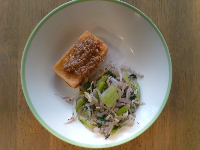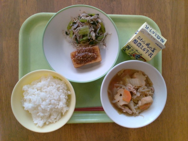 【本日の献立】 揚げ出し豆腐のごまだれかけ ゆかり和え すきやき rice milk