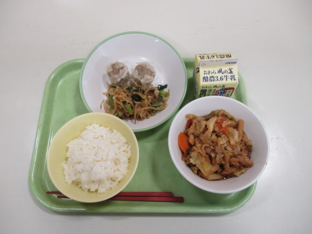 【本日の献立】 肉シュウマイ 香味和え 回鍋肉 milk rice