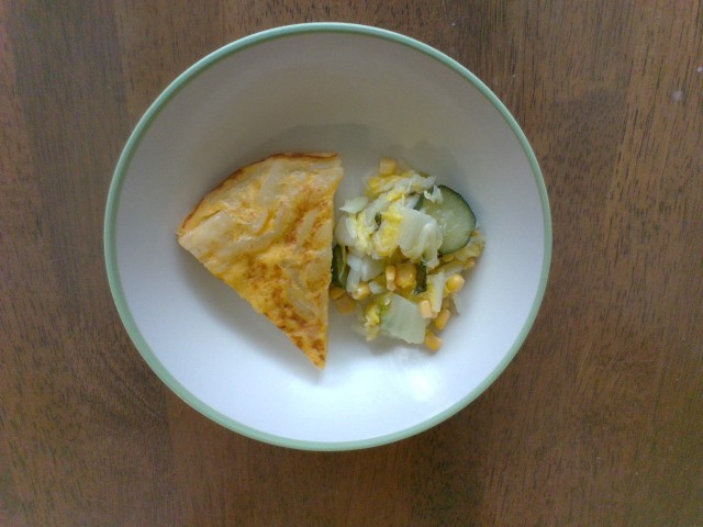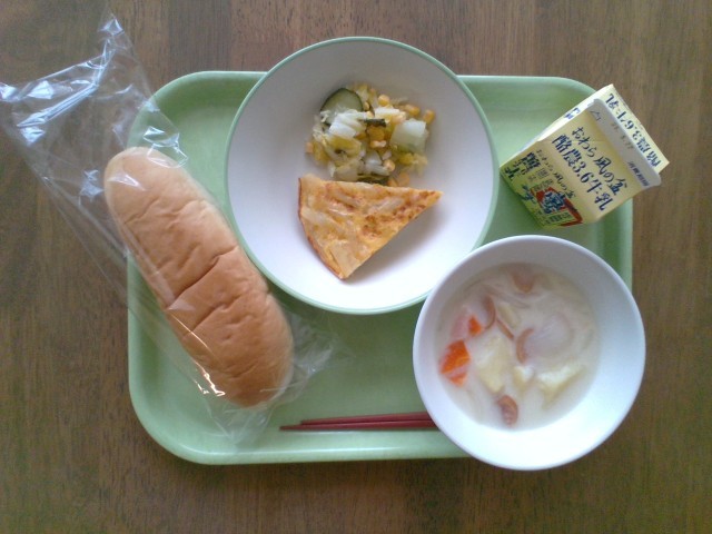【本日の献立(ほぼ片仮名)】 スパニッシュオムレツ コーンサラダ クリームスープ コッペパン milk