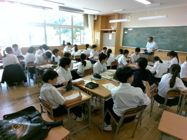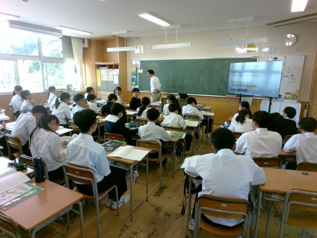 1年1組(右)は社会(地理的分野)。世界の様々な国々について学習中。人間の生活や思考は、地形や天候、自然環境や社会的条件により、相当の影響を受ける。逆に影響を与えることもある。そういう視点のもと学習を進めると、何故か用語がスッと脳内に入ってくる。